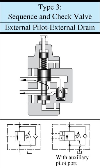 | Описание | Используется для регулировки последовательной работы двух или более исполнительных механизмов. Имеет внешний подвод линии гидроуправления и функционирует независимо от давления в главной напорной магистрали. Если давление в главной напорной магистрали превышает заданное значение, клапан открывается, сливая рабочую жидкость. При реверсировании потока жидкость проходит через обратный клапан. |