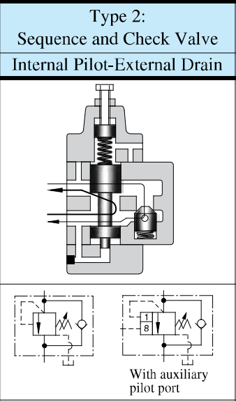 | Описание | Используется для регулировки последовательной работы двух или более исполнительных механизмов. Если давление в главной напорной магистрали превышает заданное значение, клапан открывается, сливая рабочую жидкость. При реверсировании потока жидкость проходит через обратный клапан. |